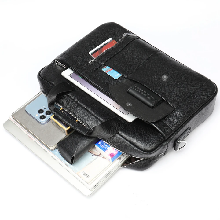 This Black Genuine Leather Laptop Bag is crafted for professionals who value class and durability. Designed to fit 14–15-inch laptops, it combines timeless elegance with practical function. With spacious compartments, smooth zippers, and a soft inner lining, it keeps your device safe while elevating your look wherever you go.